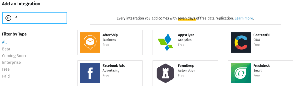 From the dashboard you can also do things like adding integrations from other data sources. The Stitch documentation walks through the process for each one.