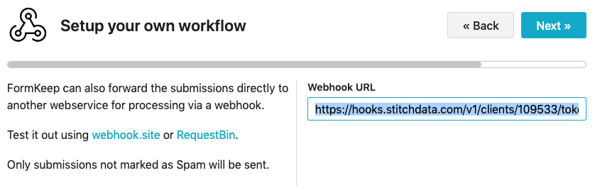 Click the Copy button to copy it, then switch back to your FormKeep account. Choose the form you want data from and, in the Settings Wizard, choose Webhooks. Paste the webhook URL, click Next a couple of times, then Finish.