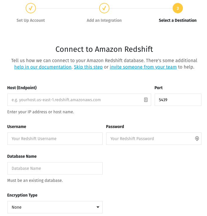 Suppose you've chosen an Amazon Redshift data warehouse. Clicking on the Redshift icon brings you to a screen where you can enter your credentials: