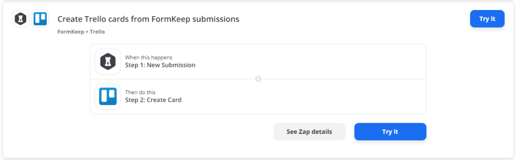 Trello is a well known productivity tool that helps teams keep track of their work projects, update the statuses of projects, assign tasks and a lot more, from a single online platform. Its layout allows you to see everything about all existing projects, at a single glance. Zapier's most popular connection of these apps allows you to create new cards on Trello from a submission on FormKeep.