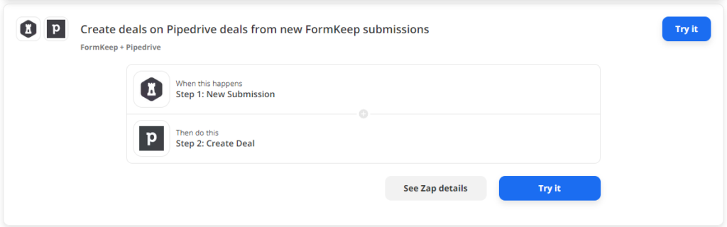 PipeDrive is available as a web application as well as a mobile app, making it a great option for business owners who are constantly on the go. It is a customer relationship management software with features that are designed to boost your productivity. Zapier’s integration of PipeDrive and FormKeep is most popularly used to automate the process of creating Deals using submissions.