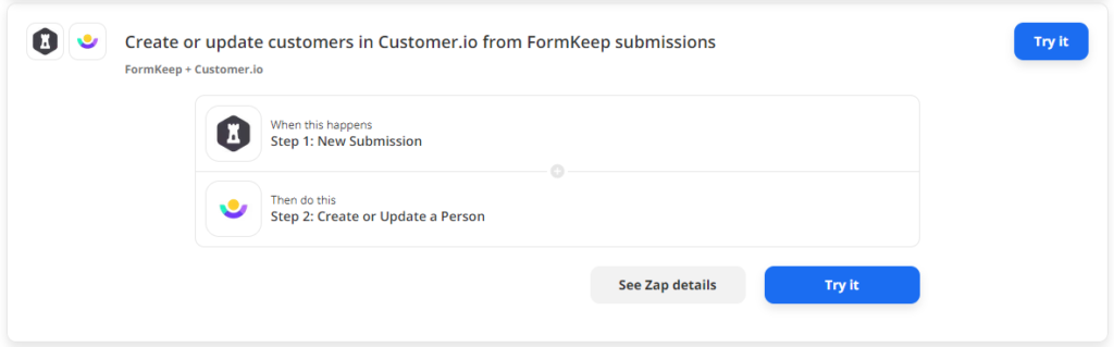 Customer.io is an automated messaging platform which allows you to craft well thought out messages and emails, and send them to the right people in order to boost your business. Although it’s aimed at tech-savvy marketers, its wide range of features and allowance for creativity makes up for what may seem like a complicated interface. FormKeep allows you to create and update Customers using form submissions. Moreover, when these apps are further connected with Webhooks by Zapier, it also lets you format responses and send data.